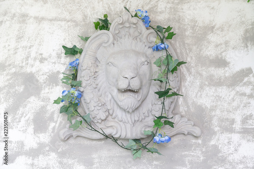 Front View Of New Lion Head Statue On Cement Wall With Ivy At Studio